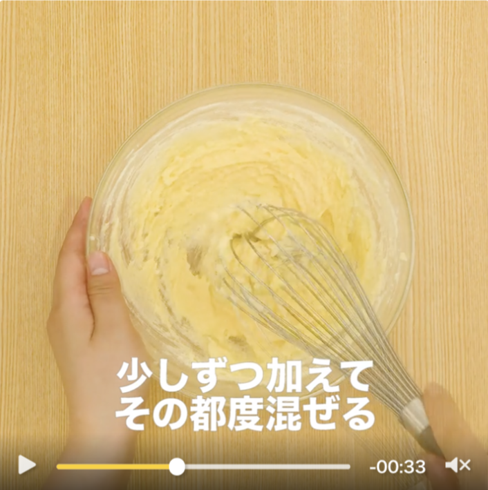 クッキーやパウンドケーキ、マフィンなどで、「卵を何回かに分けて少しずつ加える」工程があります。